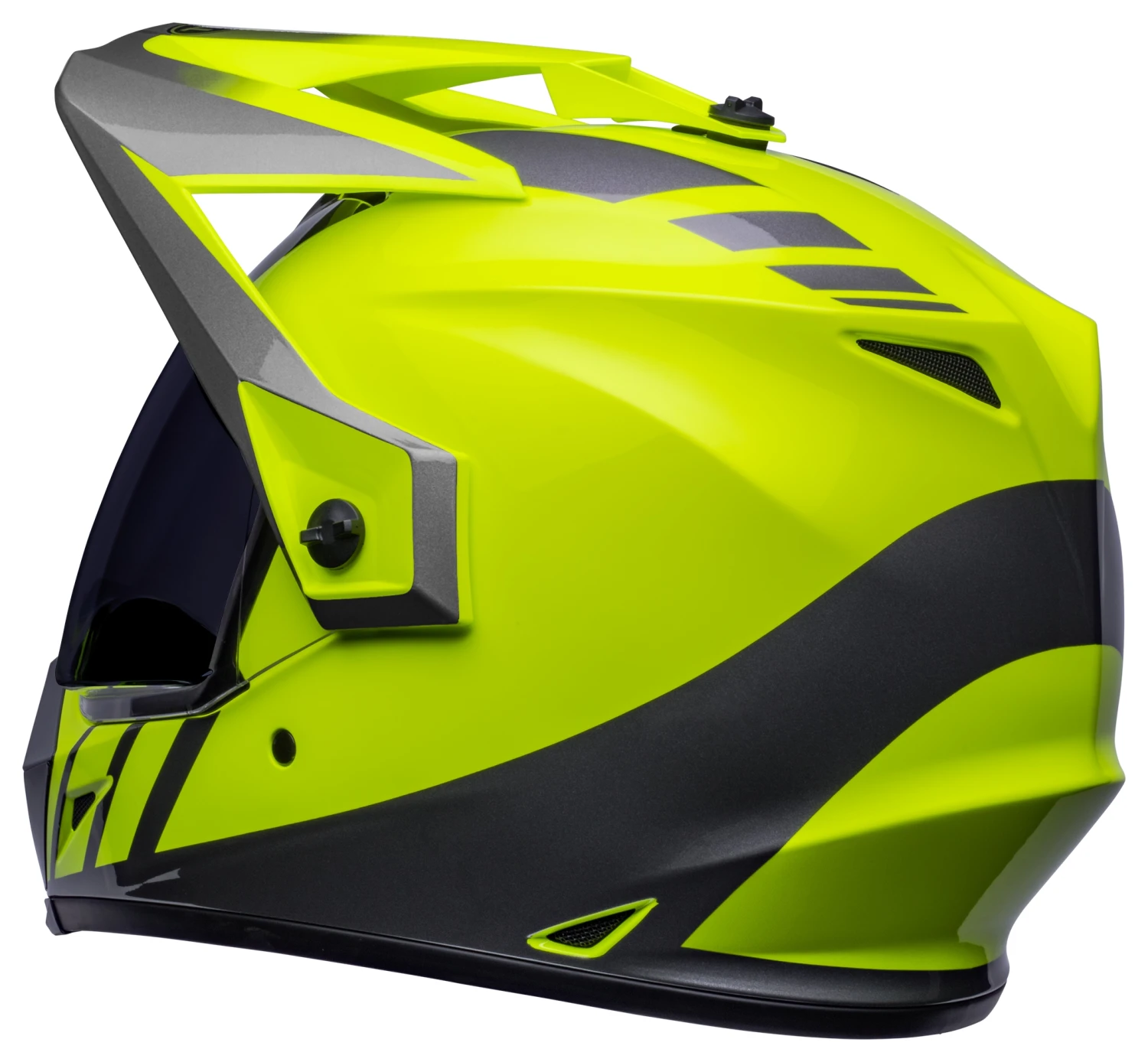 The MX-9 ADV helmet can also transform into a more streetable helmet by removing the peak visor. Included side pods replace the visor where it mounts to the helmet, giving you sleek top-gun styling. When you hit the dirt and need the added protection of a pair of goggles, simply flip up the shield and throw ’em on. The MX-9 is designed to work with any dirt goggle out there.Â
