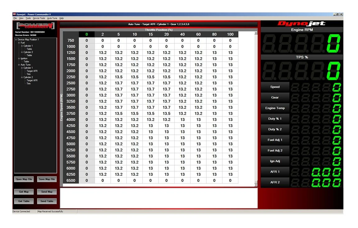 Each throttle position and RPM combination can also be individually adjustable. This allows both fuel economy during lower RPM cruising, while also maintaining peak output at larger throttle openings. For most models of bikes it is also possible to adjust the air and fuel ratios of each gear. This gives you total control of the fueling in every gear and throttle/RPM combination if desired.
