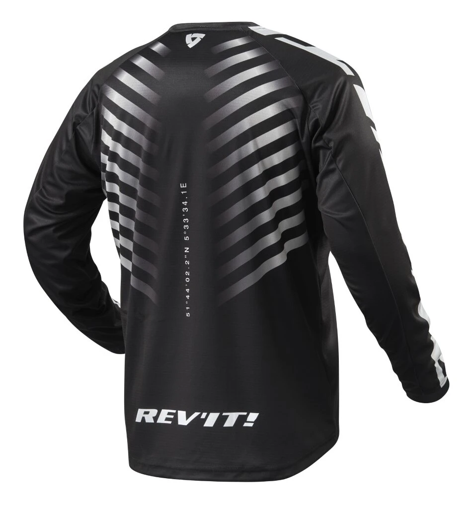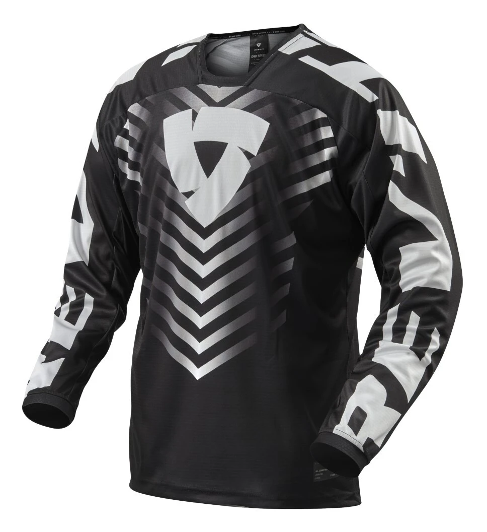 The REV’IT! Rough Jersey pays tribute to factory-sponsored pro riders and – for the first time – makes the full-size REV’IT! shield graphic available to the public. Built entirely with moisture-wicking polyester fabrics, the Rough Jersey is cut for a relaxed fit. The Rough Jersey fits comfortable with base layers and body armor. The aggressive chevron design continues to the rear.Â
