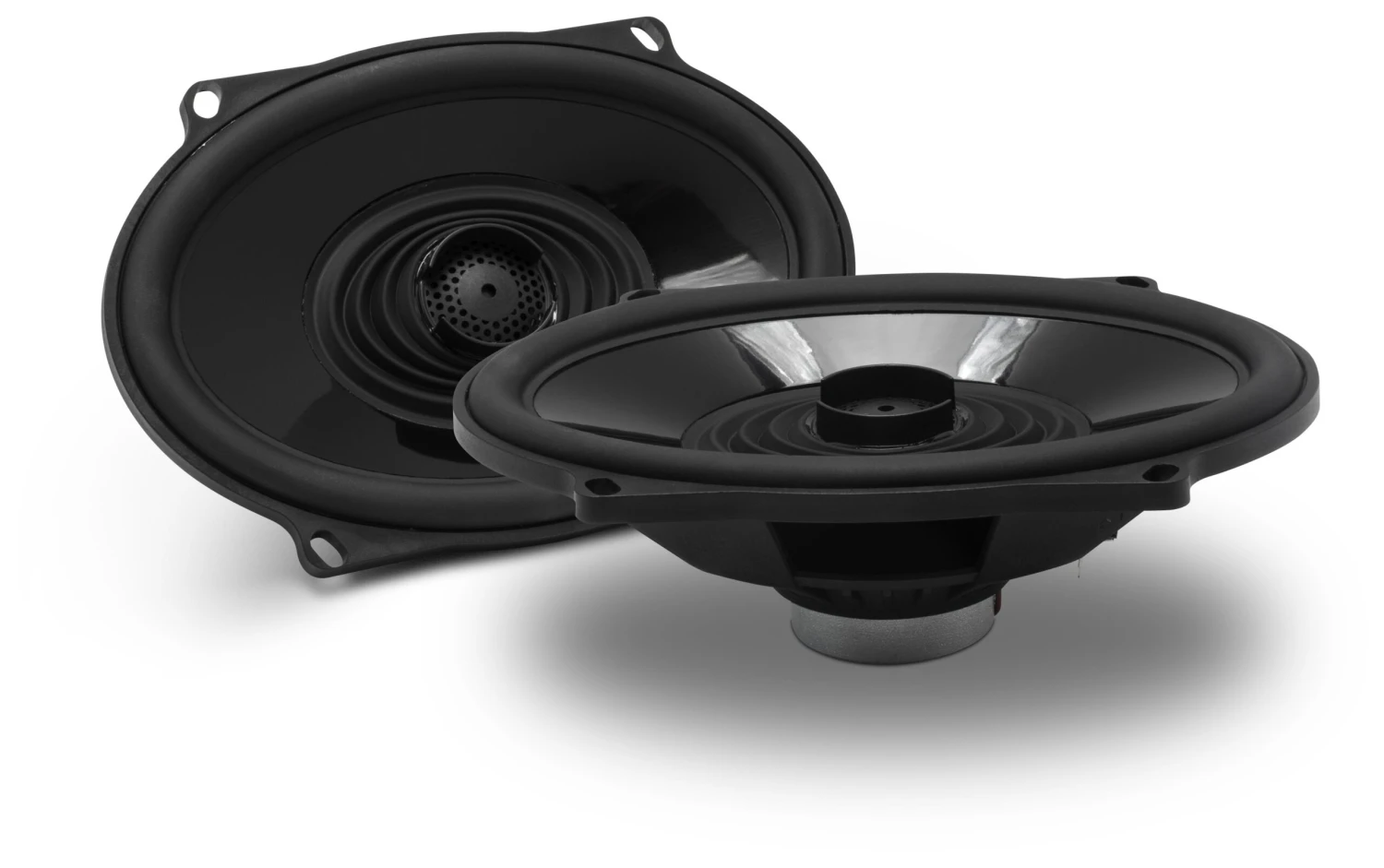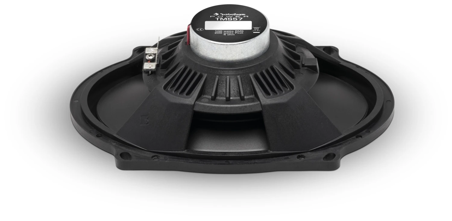 The TMS57 full range coaxial speaker is designed to replace existing 5″x7″ speakers in factory equipped “Boom!⢠Audio” and “Boom!⢠Audio Stage-I” bag lids.The Rockford Fosgate TMS series of motorcycle speakers feature a Neodymium motor structure driving a reinforced polypropylene cone with Santoprene surround. Highs are produced by an ultra-efficient 25mm dome tweeter with integrated phase plug and is made water/weather resistant with the addition of a Santoprene front isolation spider connecting between the tweeter housing and cone assembly.